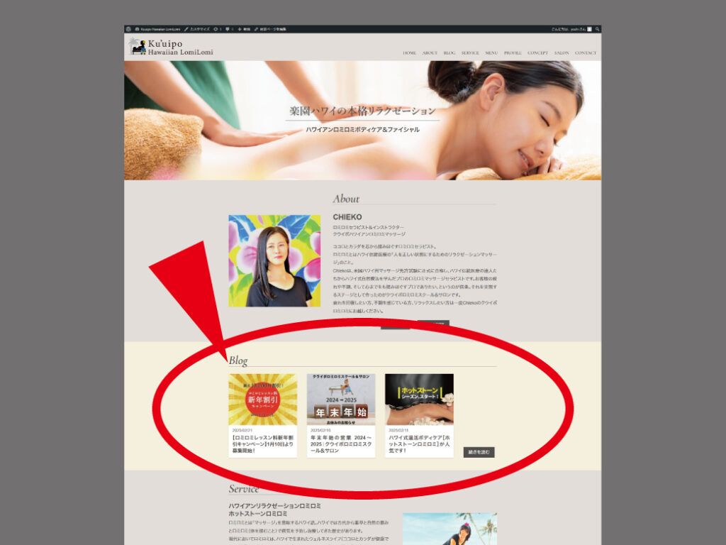 最新のブログ3記事はホームページの上段に一覧でサムネイルとタイトルが掲載されます。(写真の赤丸のところ)