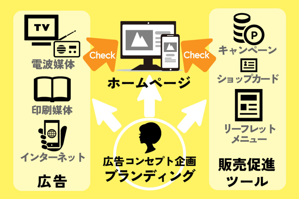 テレビ・雑誌・チラシなどは情報量に制限がありますが、ホームページなら必要な内容を網羅できます。そのため、広告の中心として活用するのが理想的です。